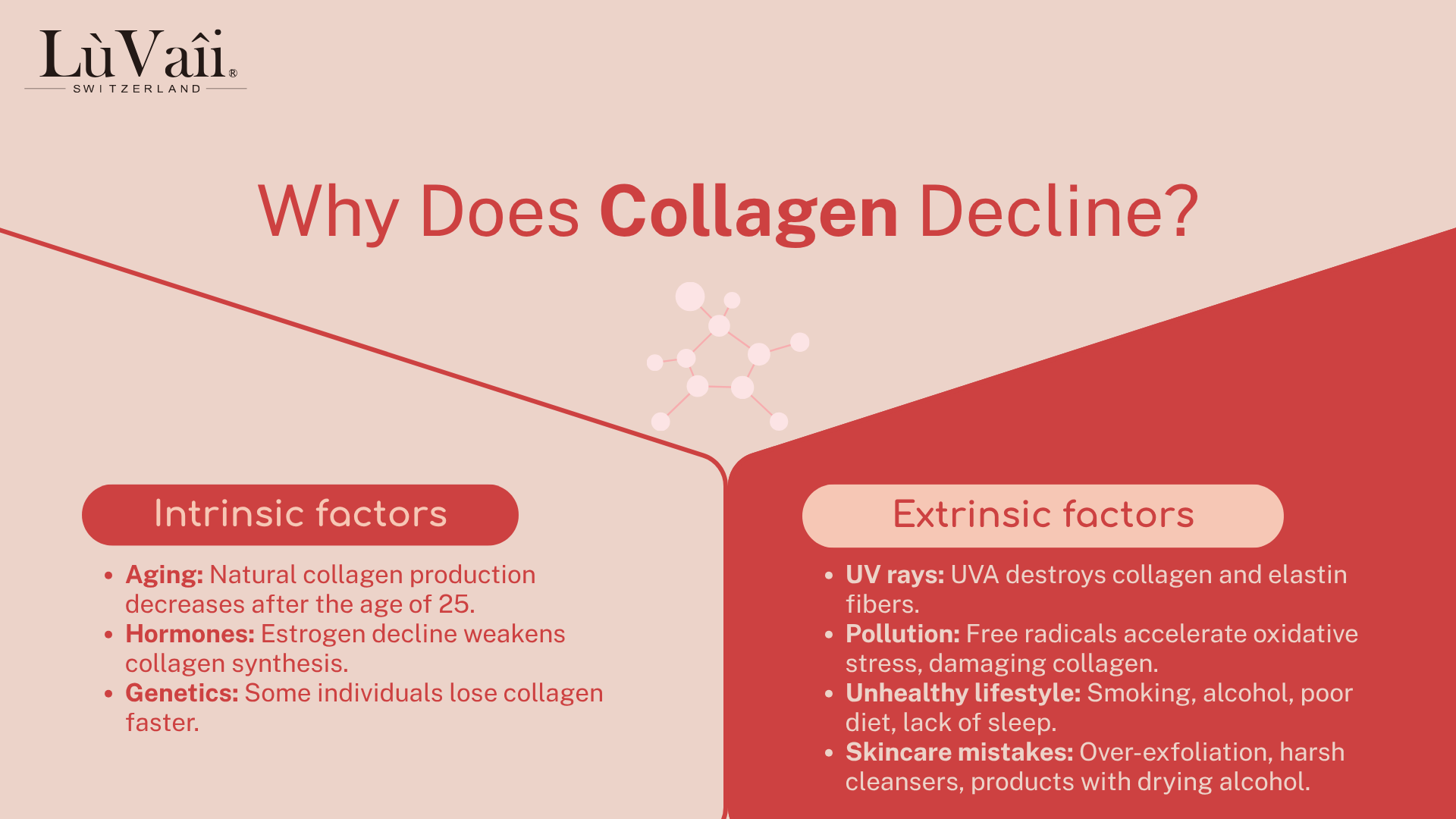 - Tuổi tác: collagen tự nhiên giảm từ sau 25 tuổi.