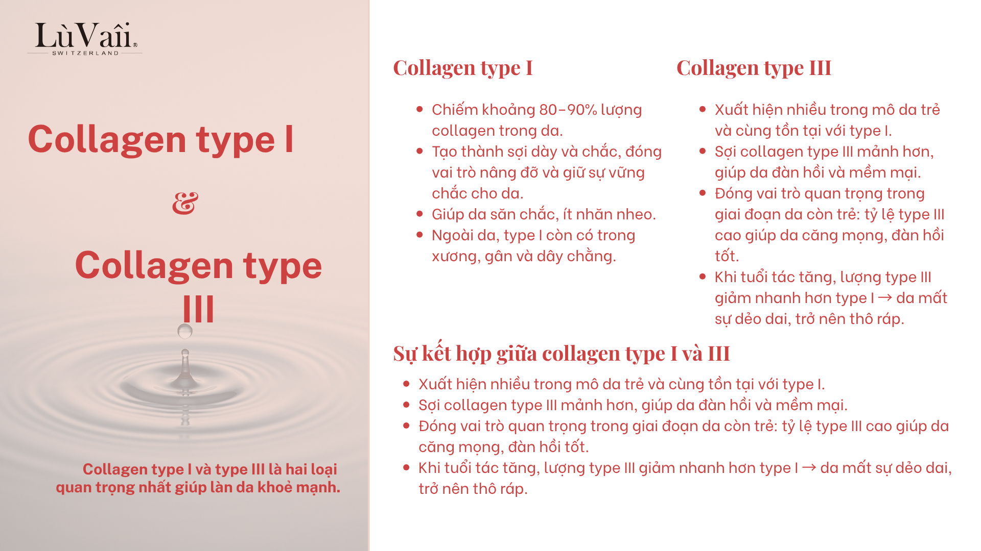 Type I giúp da săn chắc, type III giúp da đàn hồi. Cả hai phối hợp giữ da khỏe đẹp.