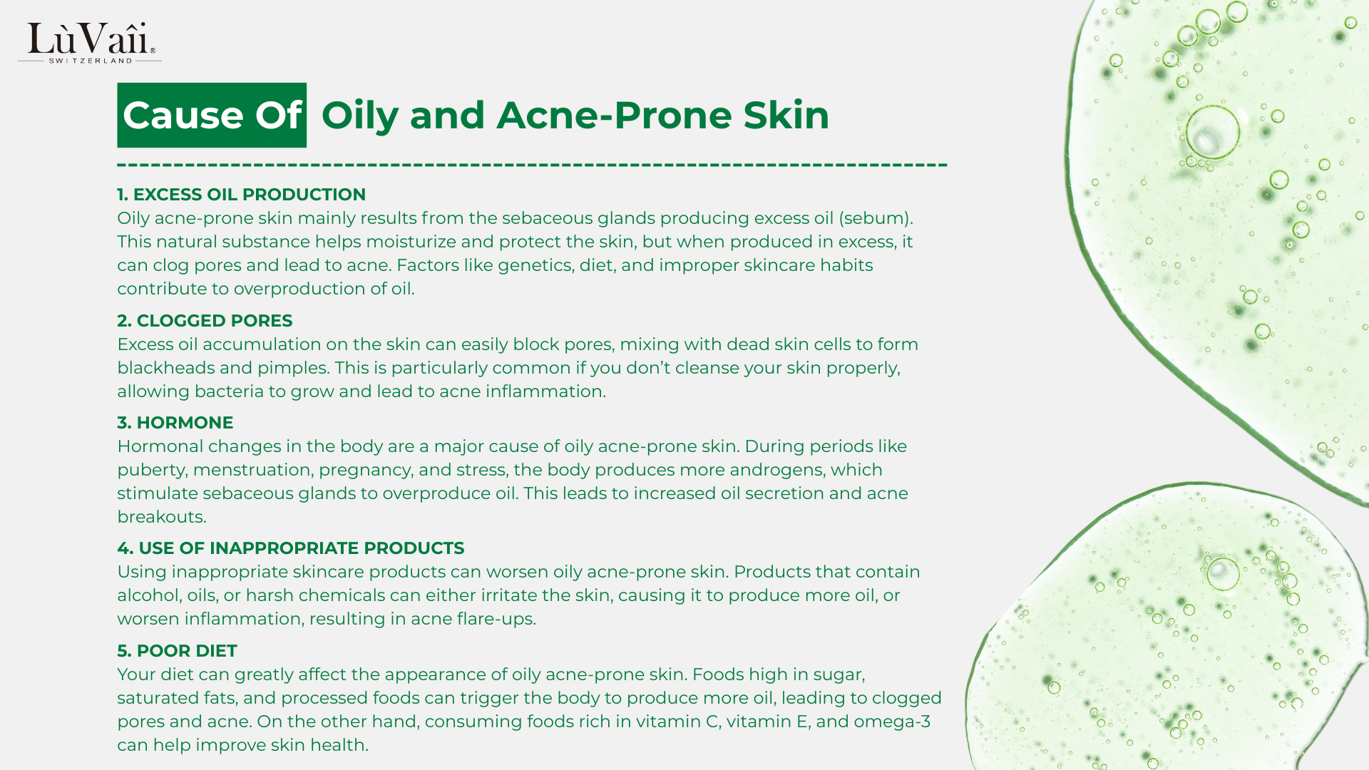 producing excess oil (sebum). This natural substance helps moisturize and protect the skin, but when produced in excess, it can clog pores and lead to acne. Factors like genetics, diet, and improper skincare habits contribute to overproduction of oil.