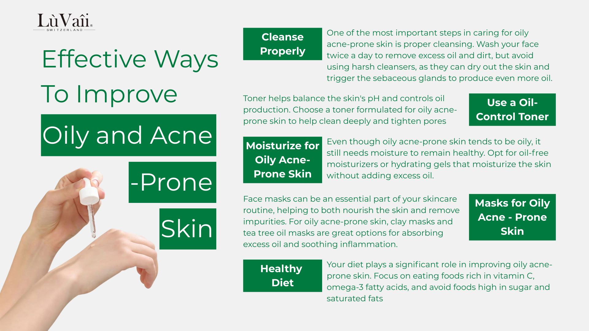 Your diet plays a significant role in improving oily acne-prone skin. Focus on eating foods rich in vitamin C, omega-3 fatty acids, and avoid foods high in sugar and saturated fats.